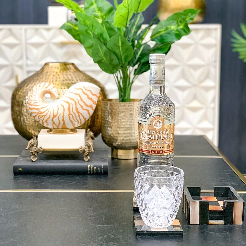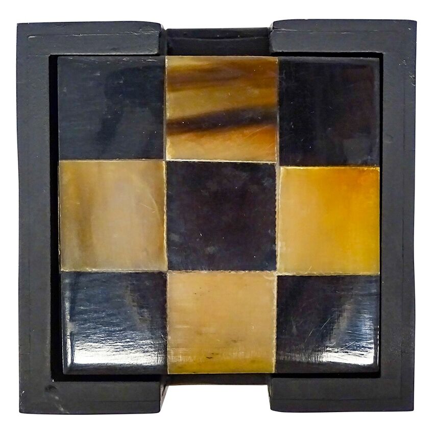 Set of 4 horn marquetry coasters in the decorative storage box. As a horn is a natural product, colours may vary